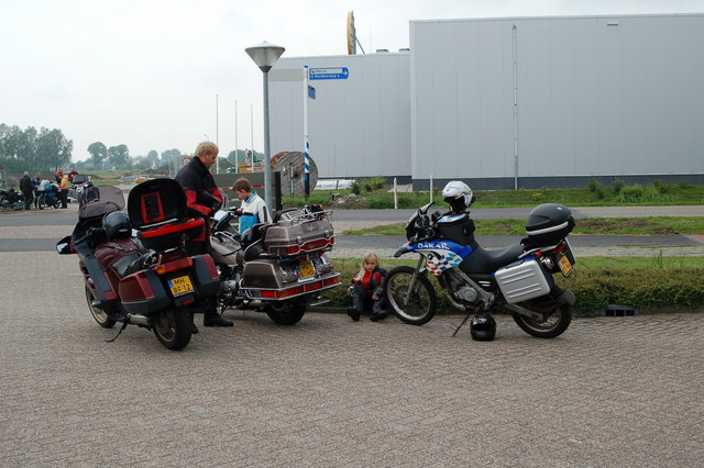 Maar vandaag is het tijd voor de Motorbeurs in de Jaarbeurs te Utrecht. Er zijn een paar redenen voor mij om daarheen te gaan. In de laatste ProMotor werd een aktie aangekondigd dat je voor 39 euro je OnRoute DVD kon inruilen voor de allernieuwste 2008/2009 versie. De andere reden is dat ik aan een nieuw motorpak toe ben. Het afgelopen jaar heb ik regenbuien bewust gemeden, omdat dat geheid een nat pak betekende. Ik heb geen zin in gedoe met "behandelingen" en zo. In ProMotor las ik ook dat er door de diverse motorzaken nogal wordt gestunt met prijzen. Dus op naar Utrecht. Nee, niet met de motor. Het weer is wel goed motorweer, en het zou ook beslist op parkeergeld en benzine hebben bespaard (auto = 1:8 versus motor = 1:30). Maar Esther (5) wilde mee en verheugde zich op de patat. Het resultaat was erg lang wachten bij de balie van gps-dot-nl bij de stand van ProMotor. Ik ging eigenlijk voor een pak van Rukka. Er was een handelaar die 50% korting bood. Maar helaas werd net het laatste Rukka pak in mijn maat (XL) voor mijn neus van de kapstok gerukt. Dat was ook echt de laatste werd mij verzekerd door een vriendelijke medewerkster. Verder zoeken bracht mij bij Kalsbeek Motoren uit Zwolle. Een aardige verkoper hielp mij aan een Evolution jas voor € 199,= Een broek van hetzelfde merk in mijn maat XL was er niet meer. Maar dat is ook niet nodig. Als het qua kleuren maar bij elkaar past. Het werd dus een Rev'IT!, type "LASER" voor € 129,= Beide pakdelen zijn voorzien van de soepele KNEX protections. En ze zijn allebei waterdicht. De jas is voorzien van een uitneembare waterdichte binnenvoering en een isolerende binnenjas. Volgens de verkoper is de jas ook 99% waterdicht, maar de binnenvoering zorgt dat je dus echt zelf niet nat wordt. De broek is volgens de papiertjes wel echt 100% waterdicht. We zullen zien.... De jas is voorzien van vele grote waterdichte zakken en ruime verstelmogelijkheden om fladderen tegen te gaan. Op divers strategische plekken zitten waterdichte ritsen die je bij warm weer kan openen voor wat nodige ventilatie. Kijk, daar gaan we. Die "waterdichte" ritsen zullen wel de oorzaak zijn van de aanwezigheid van die binnen-regenjas. Het nadeel van al die binnenjassen is dat je deze jas niet zo even dicht ritst. Er komt eerst een rits, dan een klittenband-flap en dan nog een rits. Dat vind ik een nadeel van deze jas. Maar goed, in de zomer sloop ik dat er toch allemaal uit. Die binnenregenjas stelt niks voor en past als een klein balletje in mijn tanktas. Mijn keuze is op de Revit broek gevallen vanwege zijn souplesse en omdat ie gewoon heel lekker zat. Ook van deze broek is de binnenvoering eruit te halen voor zomers gebruik. De kniebeschermers zijn ook van de soepele KNEX. Met name die soepele kniebeschermers moeten een verademing zijn bij mijn oude MQP broek, waar ik ze uit had gehaald vanwege het knellen en zo. |